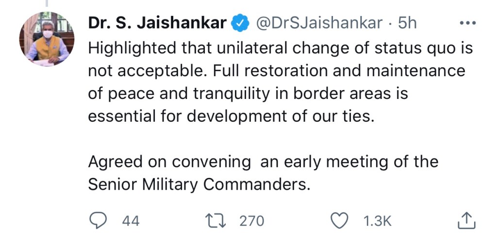In a statement the External Affairs Ministry has said “Jaishankar and Wang had a detailed exchange of views on the current situation on the LAC and other issues related to the overall bilateral relations during their meeting”.