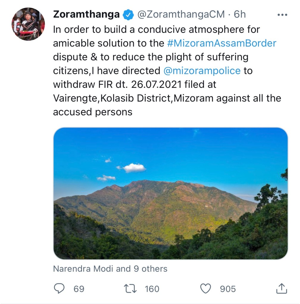 - On 1st August, 2021 – Mizoram said it will drop the FIR filed against Himanta Biswa Sarma Assam following this CM Assam also said that it withdrew the police case against K Vanlalvena, Rajya Sabha MP from Mizoram as a goodwill gesture.