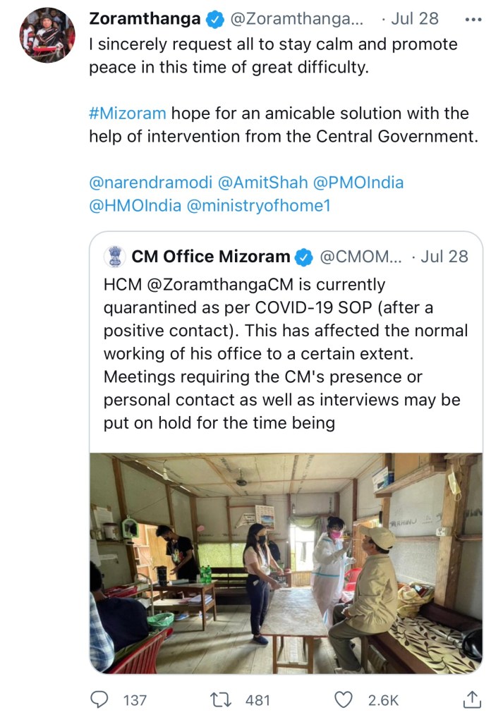 - On 30th July, 2021 – Assam issued an advisory for its citizens to not travel to Mizoram and also ordered checking of all vehicles coming from Mizoram. Mizoram police filed an FIR against Assam’s CM Hemanta Biswa Sarma and six top state officers.